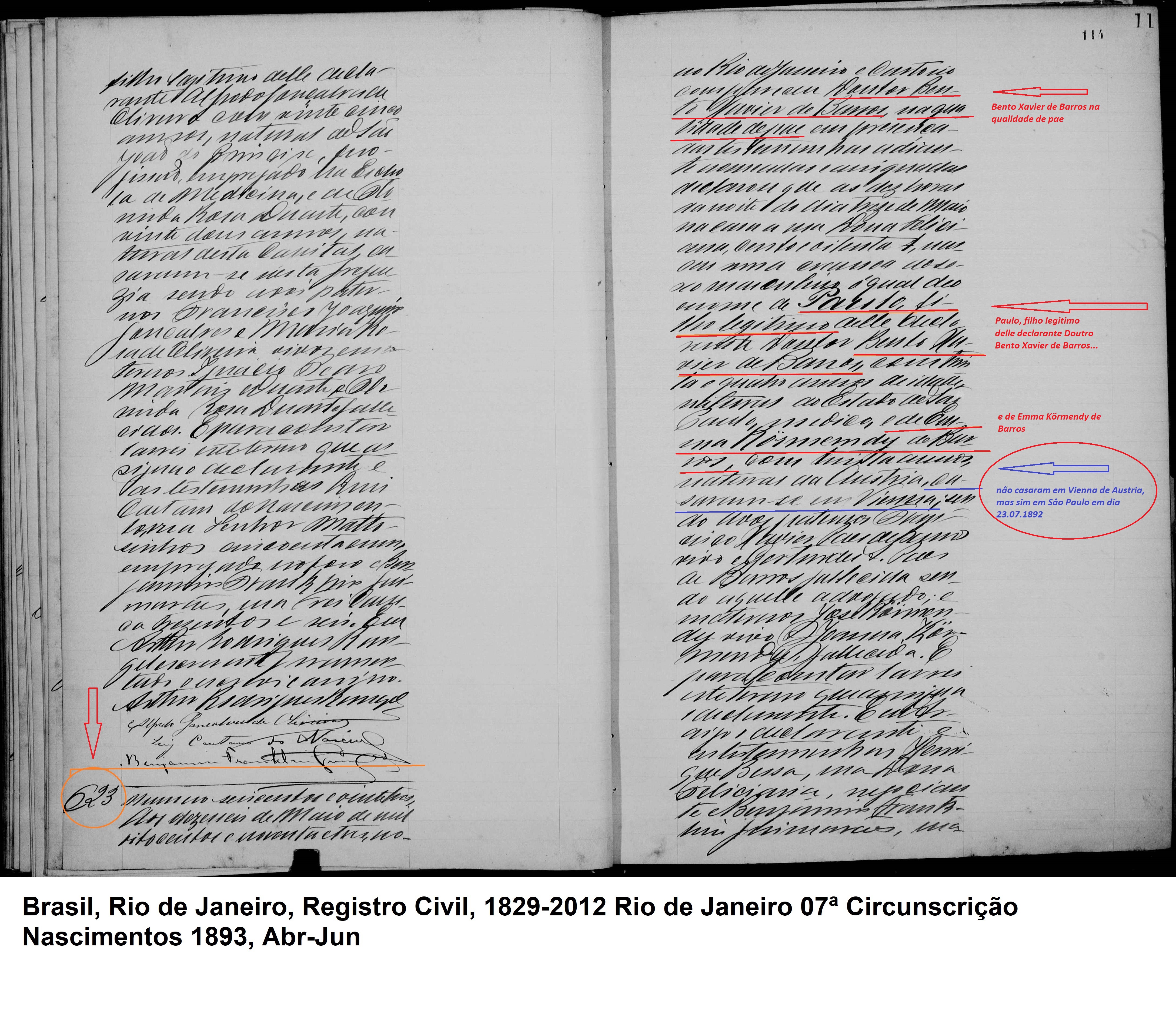 1).   23.07.1892 o casamento civil em Sânta Ifigenia Sao Paulo do Dr. Bento Xavier de Barros e Emma Florentina Maria Körmendy